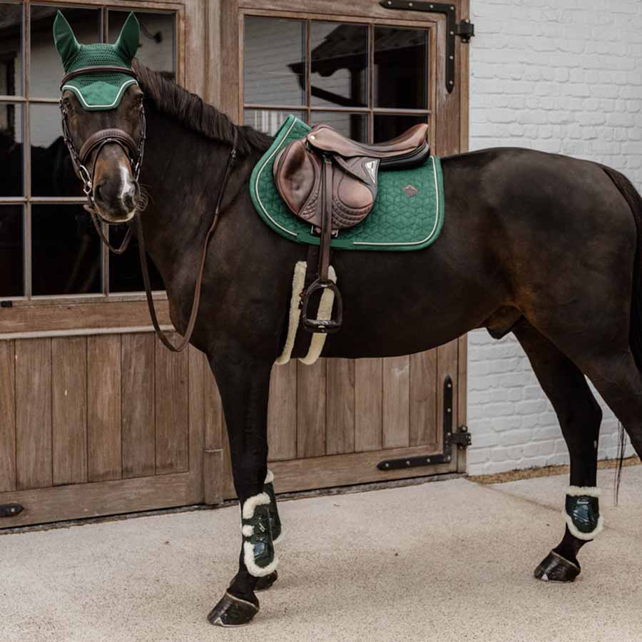 The Kentucky Tendon Boots in dark green are an excellent choice for riders who value both sustainability and functionality. These boots are made with a strong TPU shell featuring multiple ventilation holes for optimal airflow and cooling. The tendon area is reinforced with a bamboo shield to prevent penetration from sharp objects, providing extra safety while riding. The bamboo shield is also antibacterial, contributing to the horse's well-being.