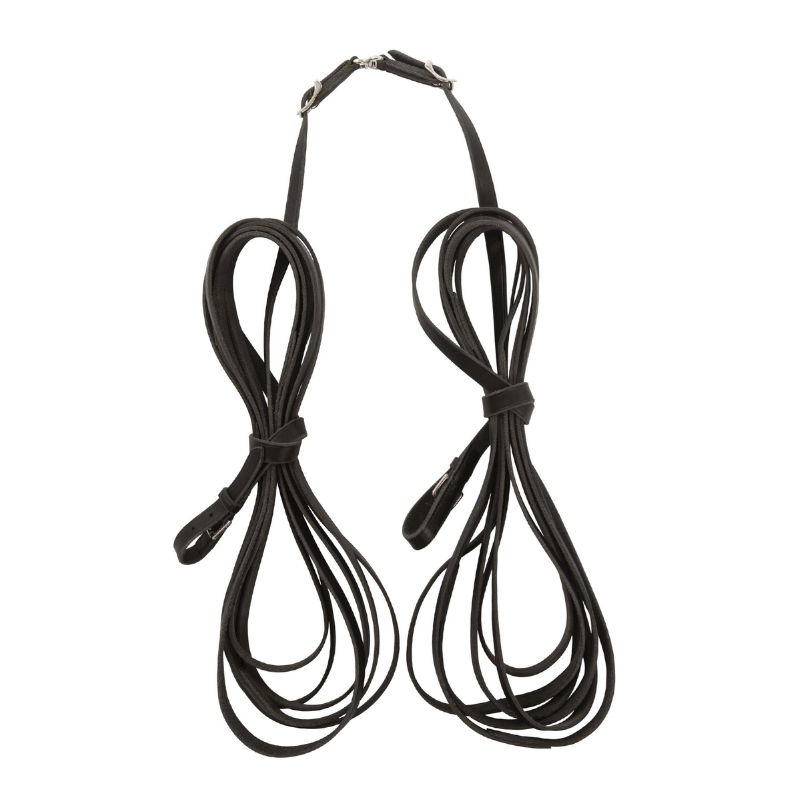 The Lippo lunge reins are specially designed for lunging and driving. Made from vegetable-tanned American Supreme leather, they offer durability and quality. These reins are separable in the middle and feature a swivel, making them easy to handle. With a width of 18 mm and a thickness of 3 mm, they provide a comfortable and secure grip. The classic black color complements most tack.