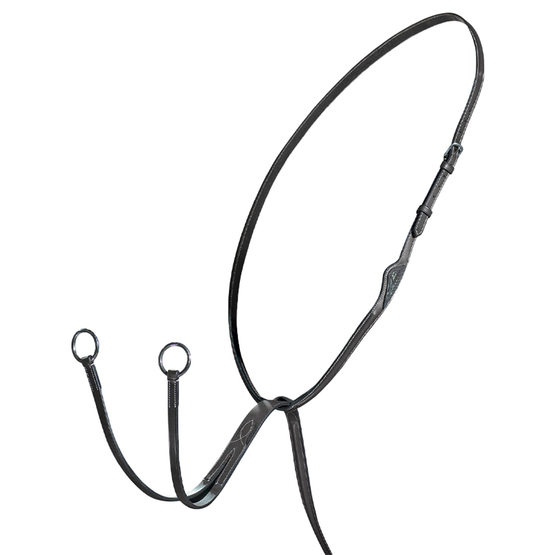 Black, classic martingale from the renowned Equiline, with steel rings and buckles, and an adjustable neck strap. On the left side, Equiline's logo is also featured as a stylish, luxurious detail.