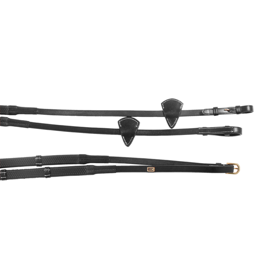 Black rubber reins with high-quality Italian leather, billets, and white stitching. The reins have been finished with both Equality Line's iconic E-logo and brass metal details.