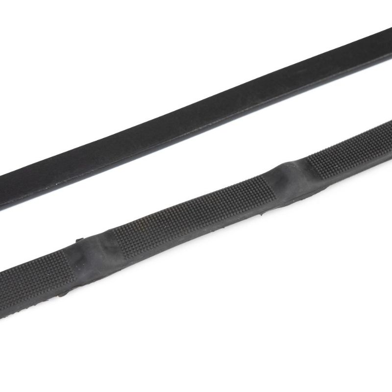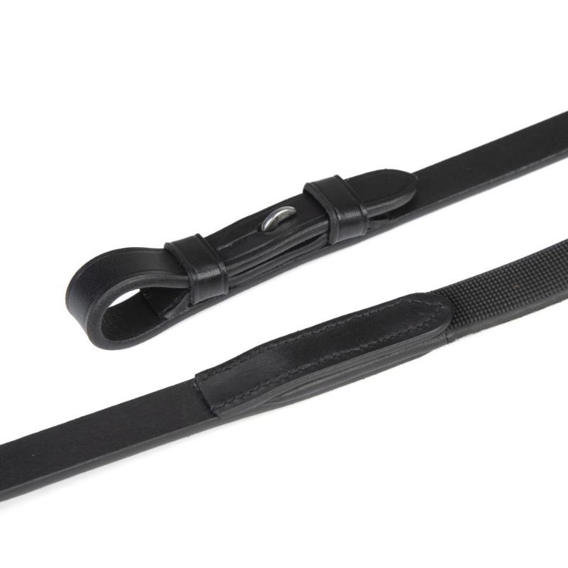 The Velociti Lusso Elite Pro reins are crafted for a smooth and secure riding experience. Featuring KRIS® ergonomic rubber grips, these reins provide a low-profile grip with raised stops for enhanced control. The nylon core offers strength without stiffness, ensuring a balanced feel. Made from exclusive European vegetable-tanned leather, they include stainless steel fittings and Velociti detailing, focusing on comfort, precision, and performance. The color is a sleek black.