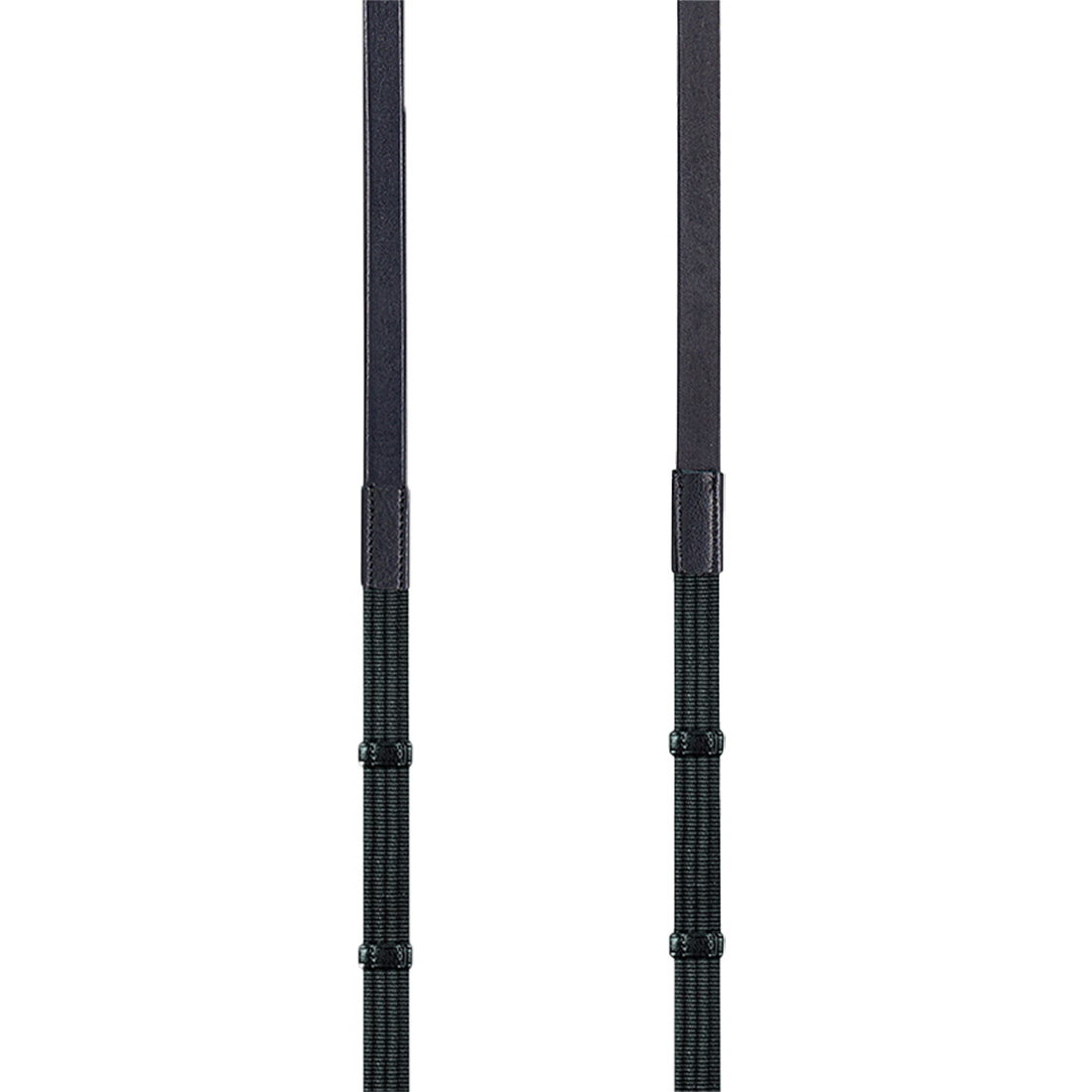 Black, classic webbed reins from Equiline. Developed with 6 leather stops to ensure good grip, as well as inward-facing buckles and wide, triangular martingale stops.