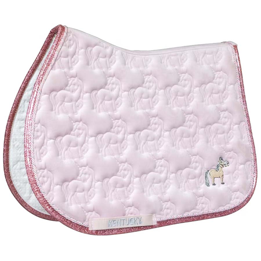 The Unicorn Head Glitter Saddle Pad from Kentucky Horsewear features a quilted pattern of small unicorn heads and a sparkling rose-gold glitter binding, finished with the cute Sammy logo as a charming detail. The saddle pad is anatomically shaped to follow the horse’s back and stay securely in place under the saddle.