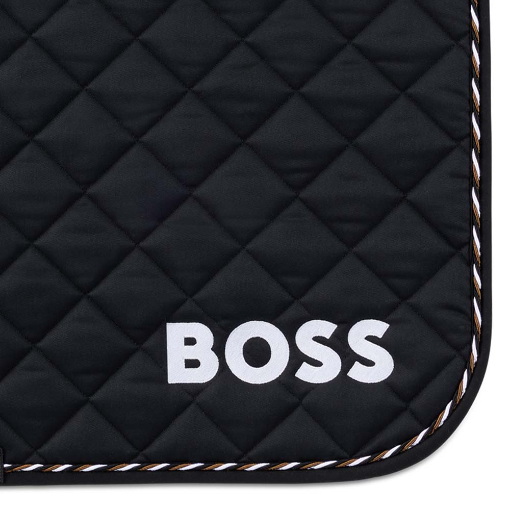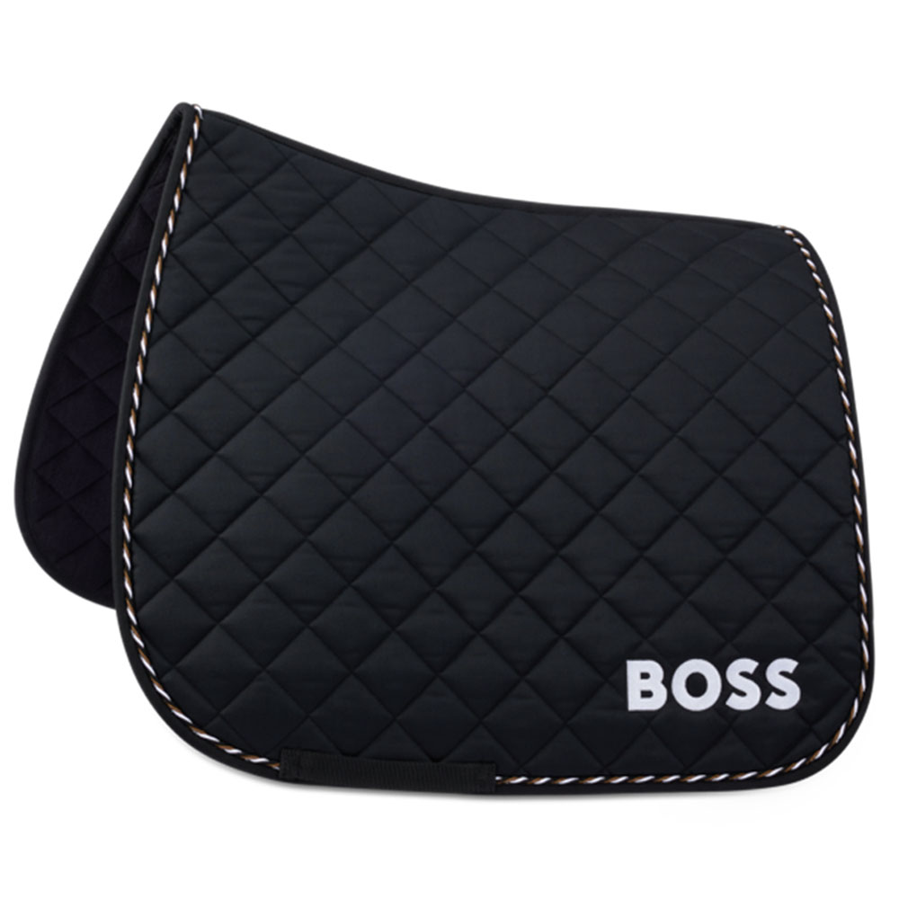 The BOSS Equestrian Dressage Saddle Pad Signature in black is designed to provide optimal comfort and functionality during your rides. Featuring the BOSS Signature Stripe as piping and high-quality logo embroidery on the left side, this saddle pad combines style and performance. It is crafted for wither relief and ensures it neither slips nor flaps under the saddle. The filling effectively wicks away moisture, keeping the horse dry and comfortable.