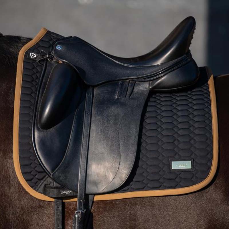 The model features a three-compartment girth strap designed for dressage saddles, and a metal badge with the CATAGO logo adds an exclusive detail.