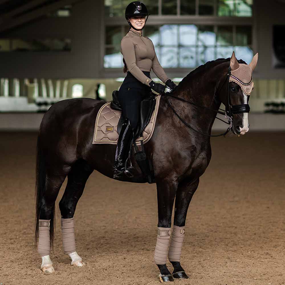 This elegant dressage saddle pad in beige with gold details is both stylish and functional. Made from 100% non-recycled polyester, it is treated with High IQ cool comfort, providing quick-dry and moisture-wicking properties. This helps your horse stay dry and fresh for longer during rides. Feel free to style it with other pieces from our Champagne collection for a complete and chic look.