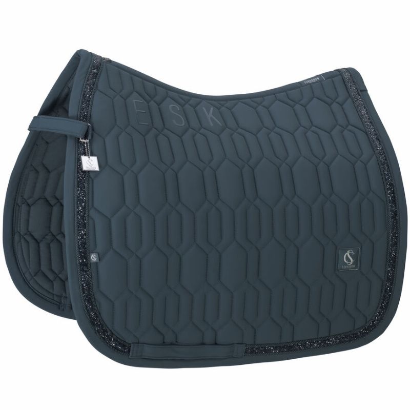The Eskadron Dressage Saddle Pad Softshell Jewel Classic Sports in green combines elegance with practicality. The exterior is made from robust softshell, while the interior features a cool-dry lining for optimal comfort. Its compact quilting offers a stylish design, and the silicone anti-slip surface under the saddle ensures it stays securely in place. An elegant combination of piping and stones with softshell edging adds a touch of luxury.
