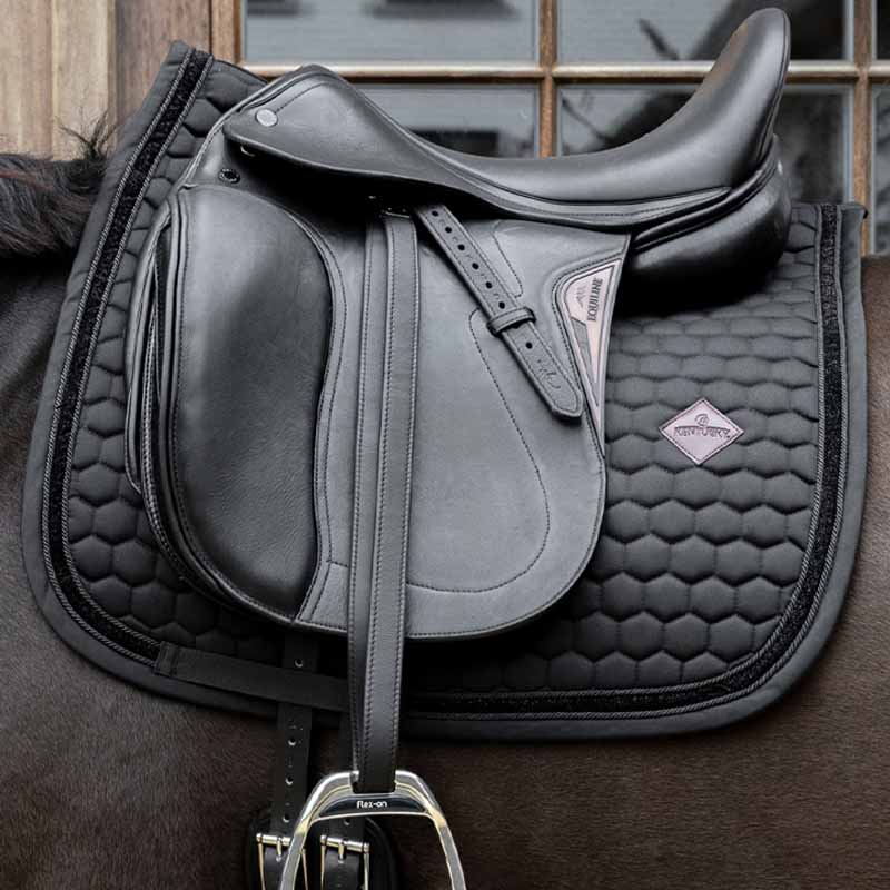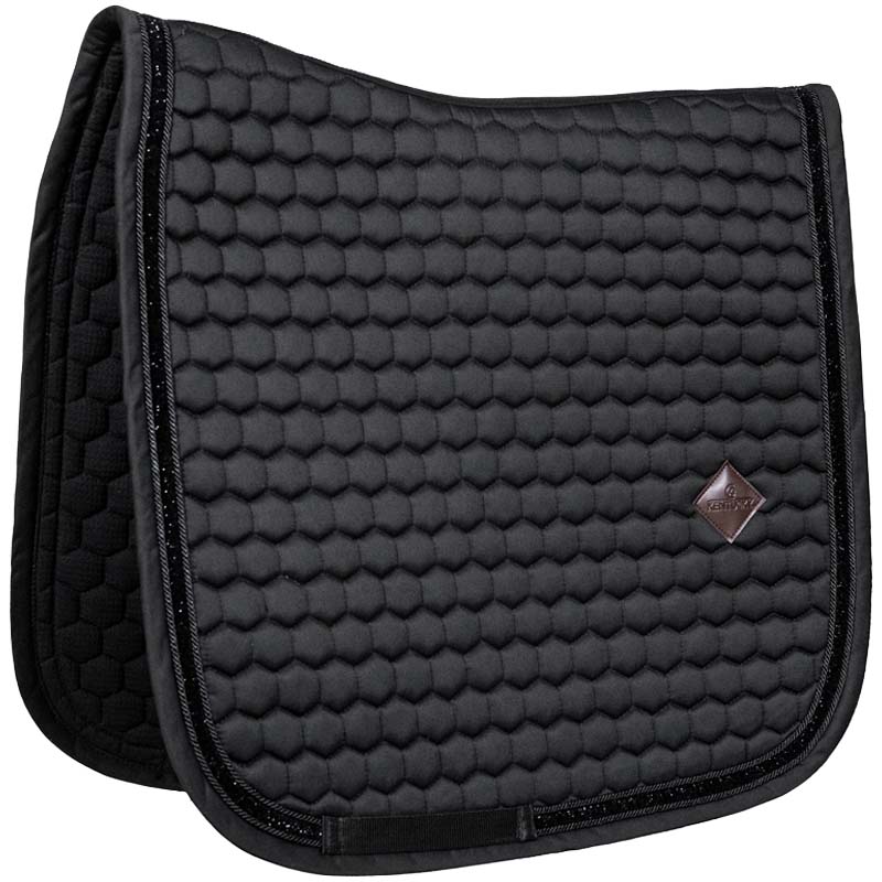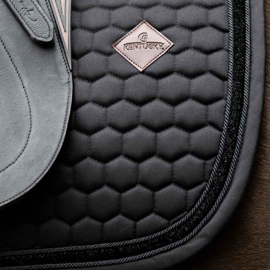 The Kentucky Horsewear Dressage Saddle Pad Glitter Band combines elegance and practicality for riders seeking style and comfort. This black saddle pad captures attention with its striking glitter band and allows for quick, hassle-free tack-up without annoying girth loops. Made from fast-drying, breathable materials, it prevents heat build-up and ensures a secure ride with its anatomical fit that prevents slipping. Additionally, it offers ample space for custom embroidery, adding a personal touch.