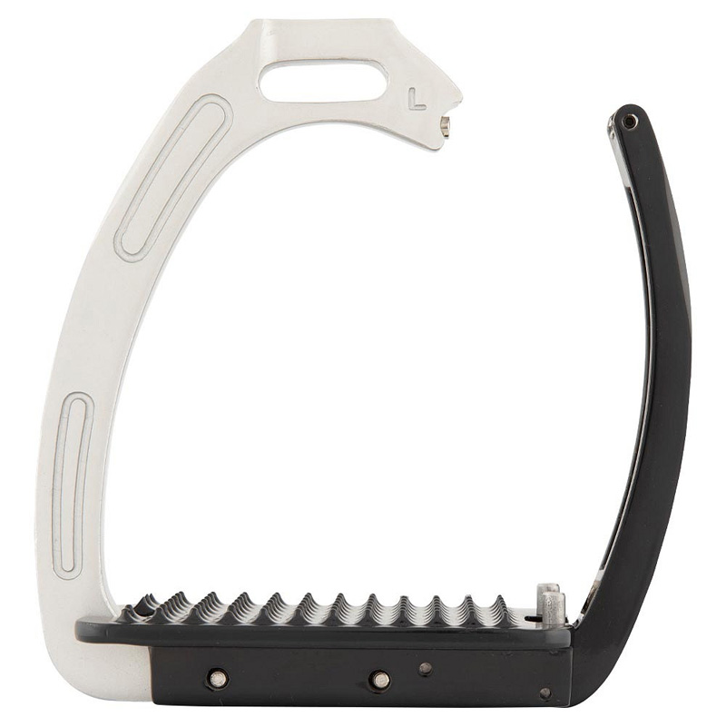 The BR Lavarone stirrups for children and juniors offer safety and style with their shiny design and magnetic safety mechanism. Made from galvanized aluminum with a powder coating, these stirrups are reinforced with stainless steel for extra durability. The magnetic safety mechanism opens in the event of a fall, preventing the foot from getting caught. Once the foot is free, the clasp automatically returns to its original position. The slightly curved opening for the stirrup leather ensures a good position, enhancing stability and leg position. Both the stirrup and tread are wear-resistant and maintain their color due to the galvanized coating. The right stirrup is marked with R and the left with L. Sold in pairs.