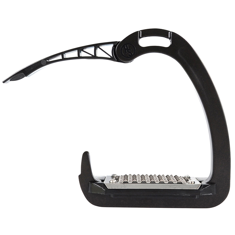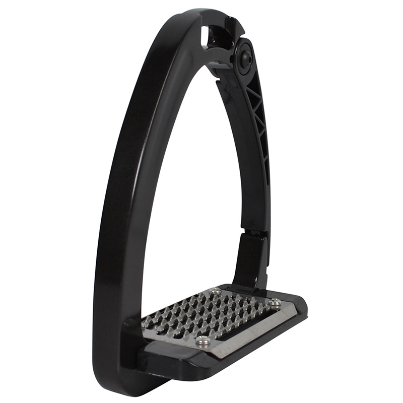 Black, affordable safety stirrups from Hansbo Sport, made with a wide stainless steel footplate that, thanks to small, effective spikes, offers optimal grip. The Abrivel stirrups are designed with a black outer arch in plastic that, in case of an accident, opens at the bottom to release the foot. Sold in pairs.