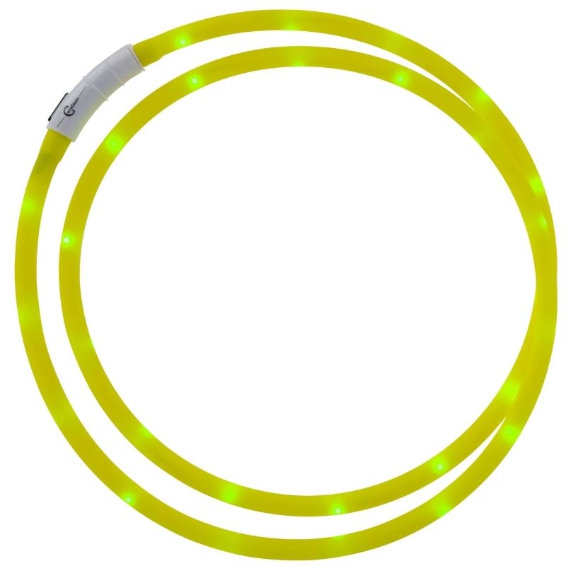 The Covalliero Reflex LED Ring is a waterproof neck ring with a yellow band, designed to provide optimal visibility up to 500 meters. The bright green LED lighting combined with the yellow band ensures the horse is clearly visible from a distance, enhancing safety during riding in the dark and twilight. The neck ring features a universal fit and can be easily shortened to the desired length, with a maximum circumference of 150 cm. It opens smoothly with a button, making it easy and stress-free to put on the horse. The rechargeable battery is charged via a USB-C cable, and you can choose between three different light modes – two flashing and one steady.