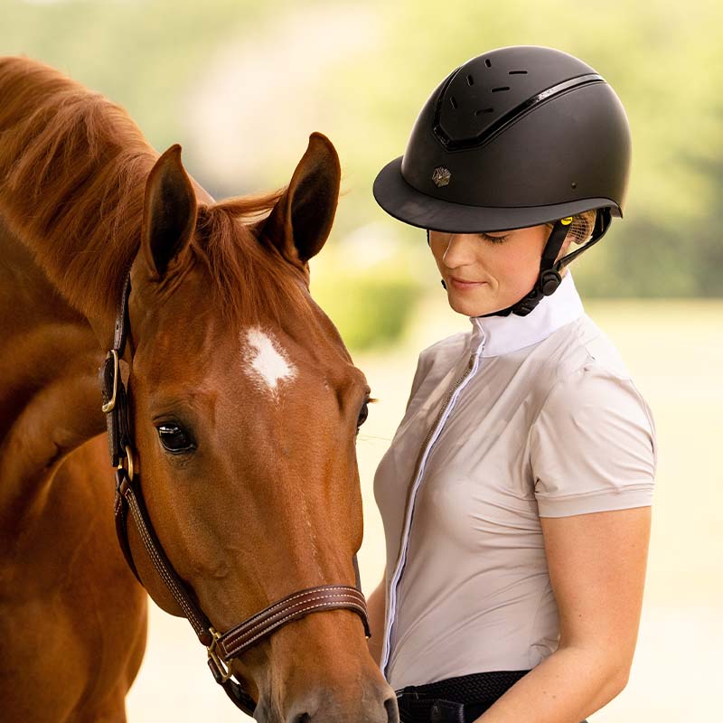 Charles Owen not only handcrafts all their riding helmets but also sets high standards at every stage of the process - whether it's about comfort, style and design, or quality and safety. The Kylo model, here with a sun visor, matte black surface, and high-gloss details, is no exception and, in addition to an incredibly low weight and MIPS® safety system, has been certified according to three international safety standards.