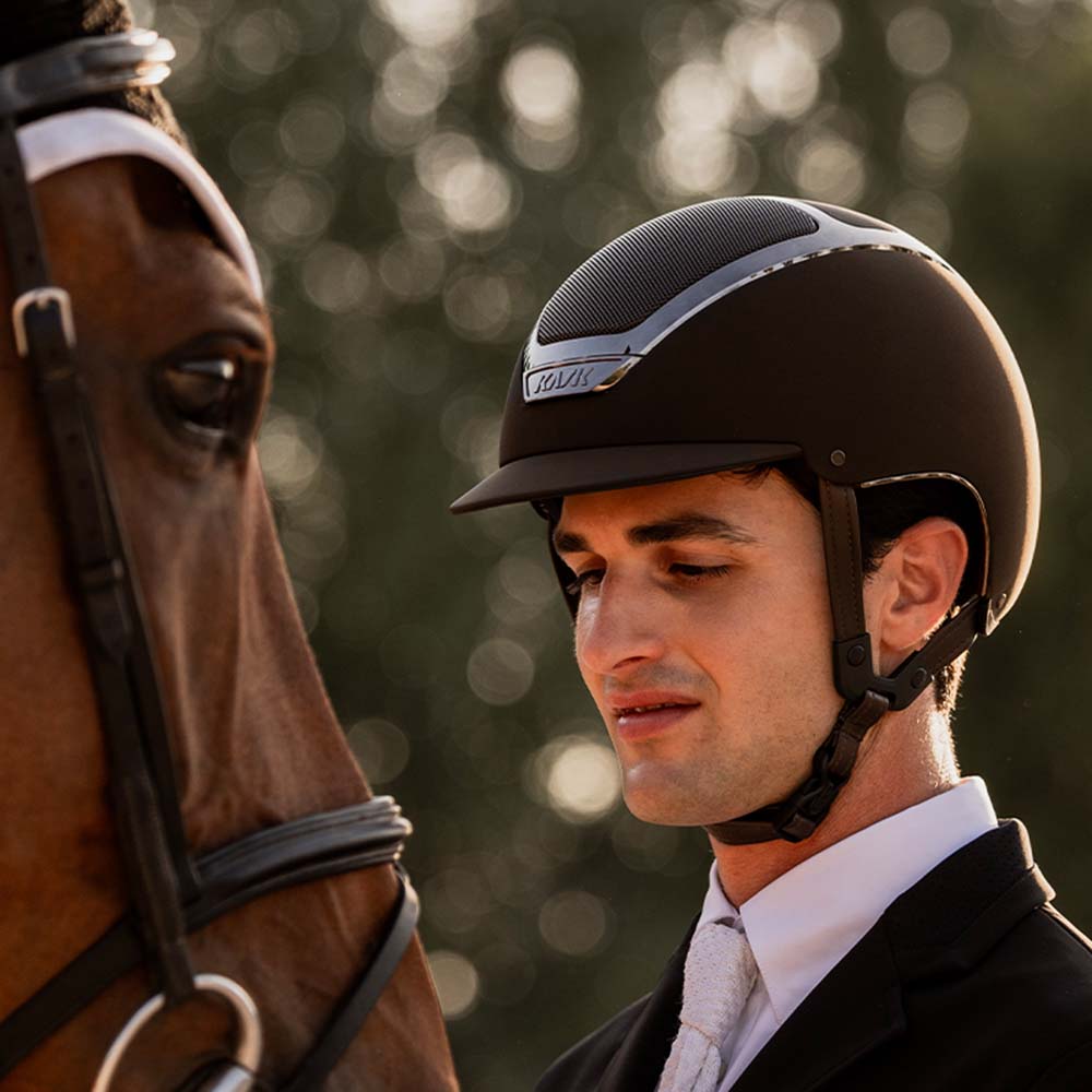 KASK Dogma Chrome, here in the color Espresso Brown, is a high-quality riding helmet with a standard peak that combines safety, comfort, and an elegant, modern design. The matte surface is complemented by subtle chrome details tone-on-tone with the shell, creating a clean and stylish look.
