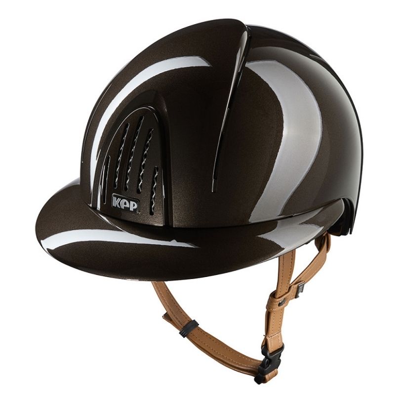 This brown version of the KEP Smart Nova Metal Polish Polo helmet, featuring a high-gloss finish and wide polo peak, is carefully designed to combine reliable protection with excellent comfort. The ABS outer shell works together with an EPS inner layer to effectively absorb impact in the event of a fall or collision. The extended rear section follows the natural shape of the neck, providing additional protection for a sensitive area without restricting freedom of movement.