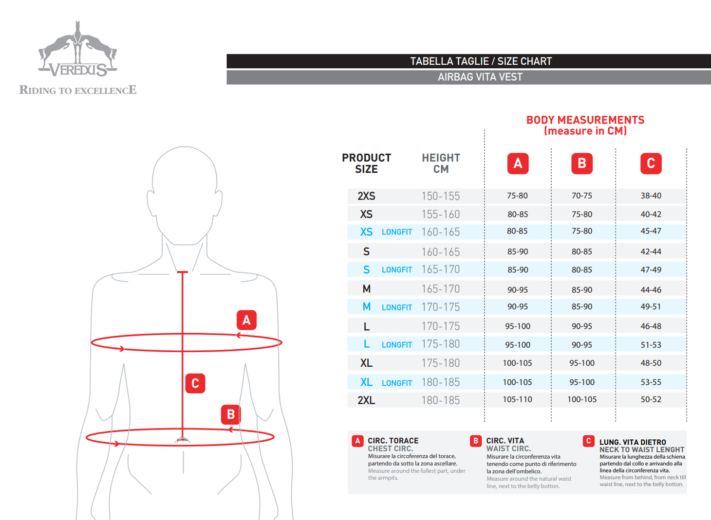For the best protection, the vest must fit correctly. Use a measuring tape and follow the size chart carefully to ensure you choose the right size for your body. The vest should fit snugly (over clothing) without being too tight or uncomfortable. During riding, you should feel full freedom of movement, and the vest should not touch the back of the saddle. The Standard and Long Fit versions help ensure a perfect fit for all riders.