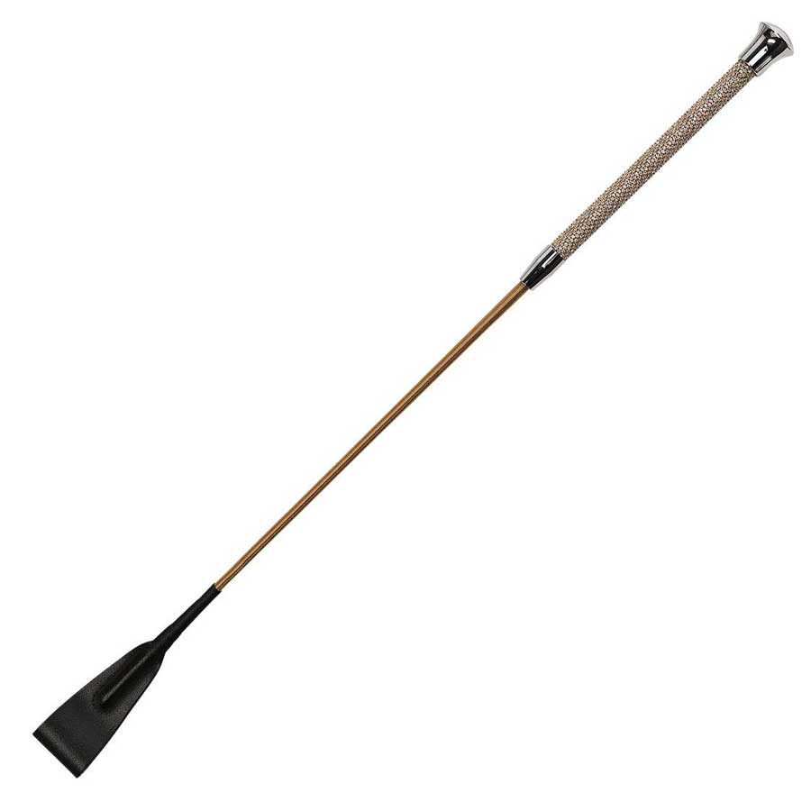Exclusive riding crop measuring 65 cm in length, making it ideal for jumping or as an all-around crop. Core made of fiberglass, making it both flexible and durable. Comes with a silver knob and a black leather flap at the bottom.