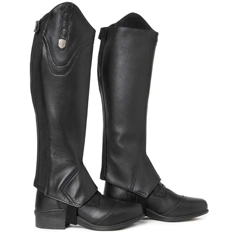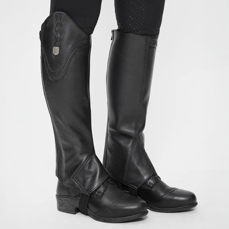 Valkyria Legging from Mountain Horse is a pair of sleek black short chaps made from soft full-grain leather, offering a flexible and comfortable fit. The leather is durable, breathable, and easy to maintain over time.