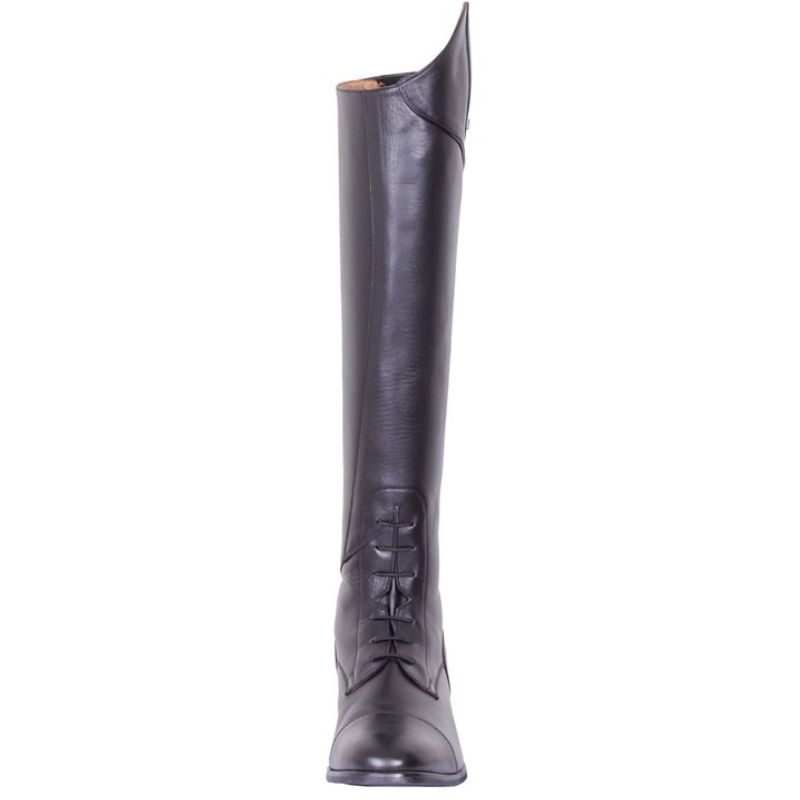 The Diabolo tall boots by By Equality Line offer a classic and sleek design with practical features. Crafted in breathable black aniline leather, these boots are lined with calfskin for added comfort. The PU insole ensures a comfortable feel during rides. At the back, a spur rest with two positions keeps spurs securely in place. An extra strong full-length zipper and robust elastic at the back provide stability and freedom of movement.