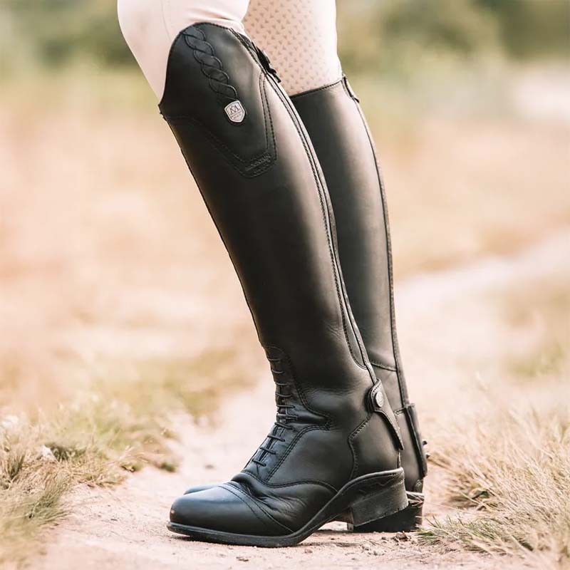 The Valkyria riding boots from Mountain Horse are crafted from soft, black premium leather and equipped with the Vertycore Advanced Sole System to ensure excellent shock absorption, grip, and stability. Valkyria also features elastic front lacing, decorative details at the top of the shaft, as well as a back zipper guard and spur rest.