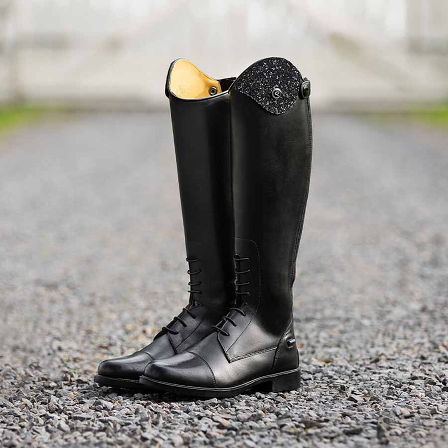 The Romy riding boots for kids are both stylish and functional. With an adjustable top, you can easily attach different designs to the boots, making them unique for every ride. The boots feature a glitter design and come with a zipper with an elastic insert at the back and elastic laces at the front for a comfortable fit. These boots are perfect for young riders who want both style and comfort while riding.