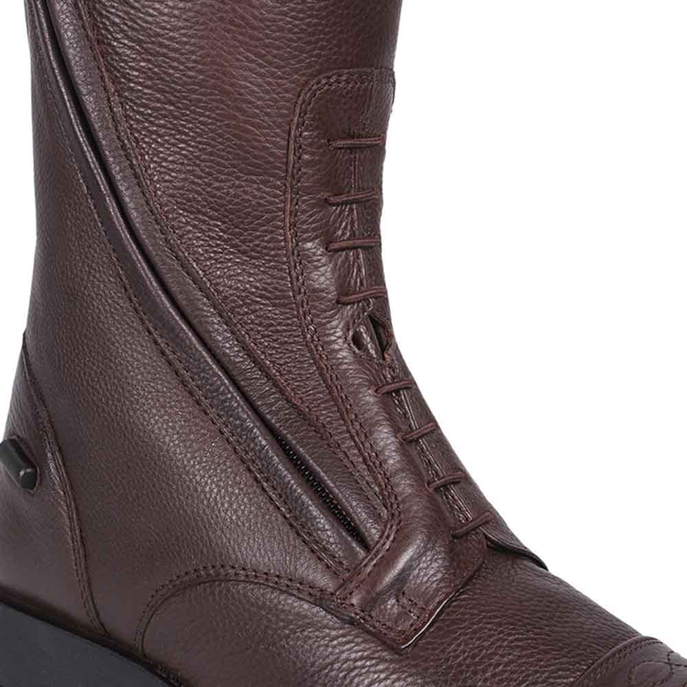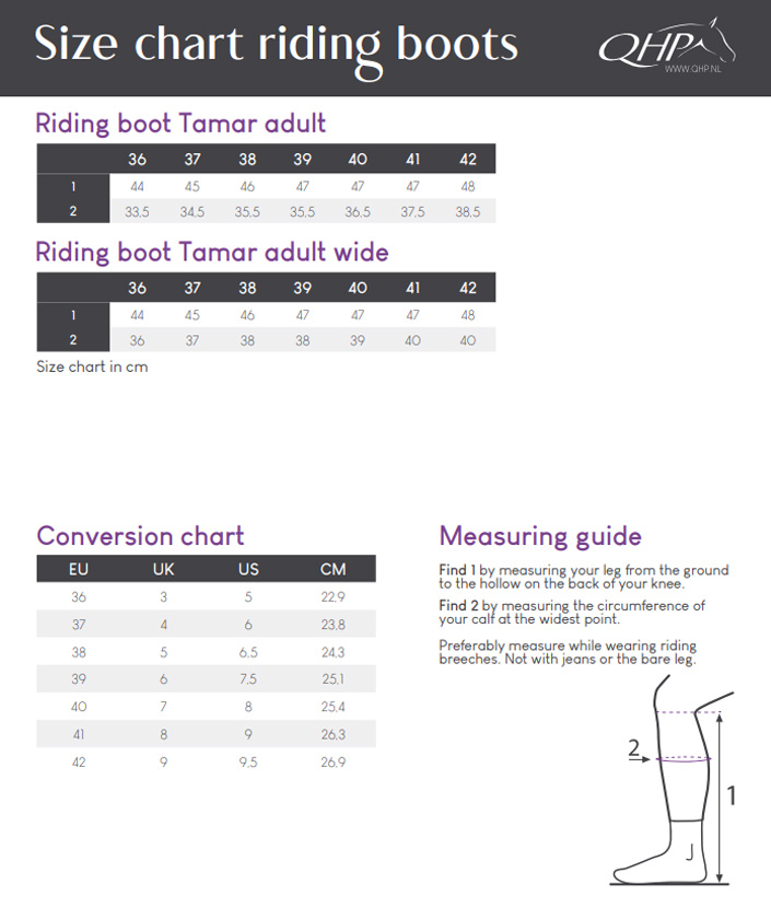 The Tamar riding boots from QHP are elegant and made from flexible, high-quality leather. The decorative line on the boot adds a stylish touch. The slanted placement of the zipper provides comfort and durability. Thanks to the flexible leather, elastic lacing, and the elastic insert at the back, these boots are very comfortable to wear.