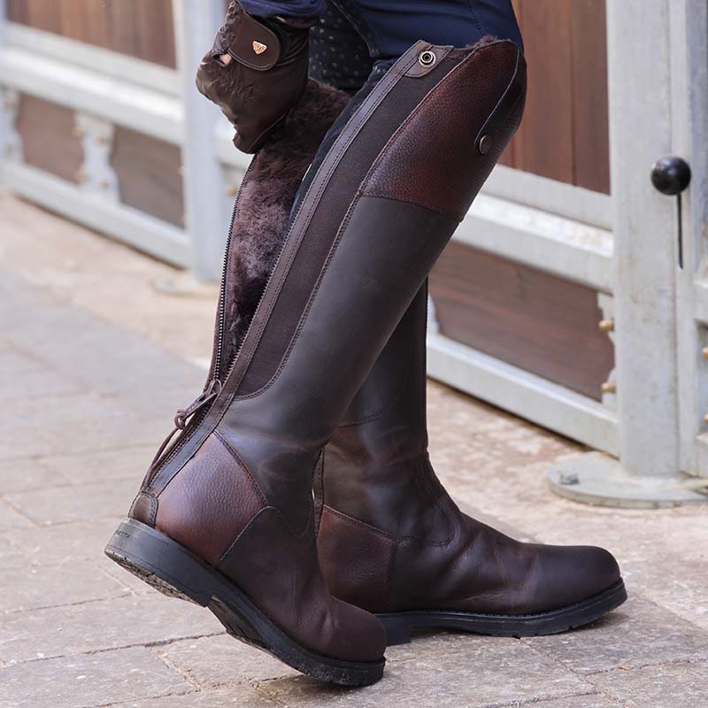 Discover the Moretta Ventura Winter Riding Boots, designed to keep your feet dry and warm during cold rides and stable work. These practical winter riding boots are made from oiled, water-repellent leather and feature waterproof membranes up to the ankle, providing excellent protection against moisture. With elastic calf panels, you get a comfortable and tailored fit, while the thermal sherpa fleece lining offers a luxurious feel and effective insulation against the cold. The shock-absorbing ActiveFlex insole and Moretta AllTerrain outsole ensure high comfort and good grip, no matter the terrain.