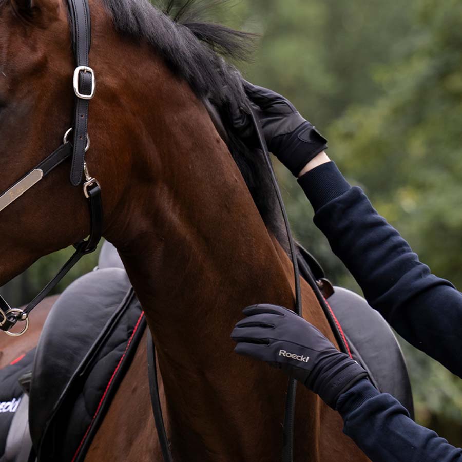 The Winsford Winter Riding Gloves are ideal for cold and rainy days in the stable or on horseback. These black unisex gloves feature a slim ComfortCut and elastic VaporFlex laminate for a perfect fit that follows the hand's movements without tension. The back of the hand is made from Duradeo, a robust and waterproof synthetic suede material that provides a non-slip grip for precise rein handling. The ROECKL-Tec Membrane keeps hands dry in harsh weather conditions, while the soft Easy-Dry lining offers extra warmth and comfort. Touchscreen-compatible thumbs and index fingers allow smartphone use without removing the gloves.