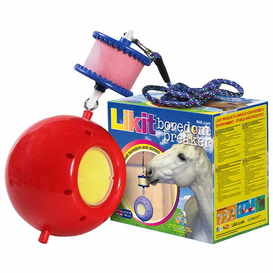 Boredom Breaker, which comes in a red color, is used with one Likit Slickstone at 550-650g and two of Likit's smaller slickstones, Little Likit 250g each. It's preferable to choose different flavors that the horse can vary between. Lickstones are sold separately.