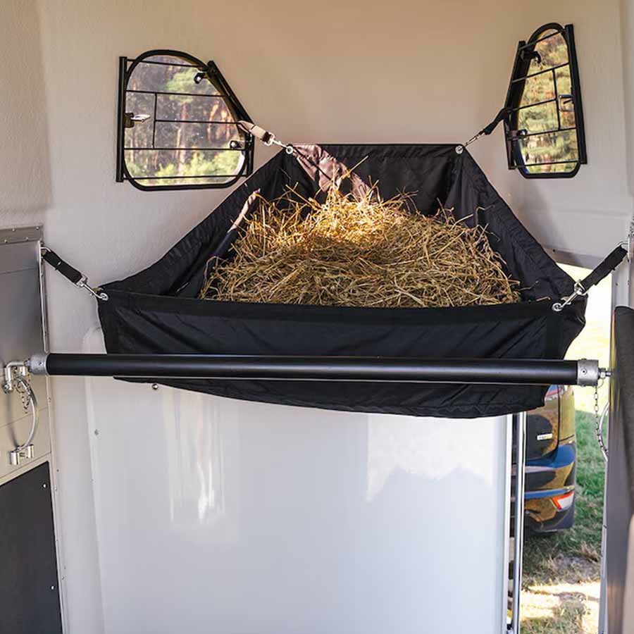 Practical, black hay bag from Hansbo Sport, designed to fit most trucks and trailers. The reinforced holes, along with the included sturdy hooks, ensure easy and secure hanging, while the triangular shape allows it to fit easily into smaller, tapered spaces. The hay bag minimizes the risk of spillage and lost feed, making it a smart and ultra-convenient alternative to hay nets and other types of hay bags.