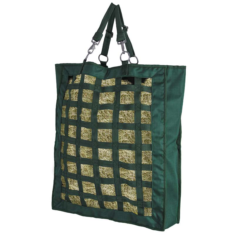 The Hay Bag Slowfeeder Turnout is a practical solution for providing your horse with feed over extended periods. It features a net with wide strips that makes it easier for your horse to reach the hay while preventing them from eating too quickly. The bag has four rings at the top with adjustable loops and clips for easy hanging. The loops can also be passed through the rings to close the hay bag, adding extra security. The dark green color blends well into the stable environment.