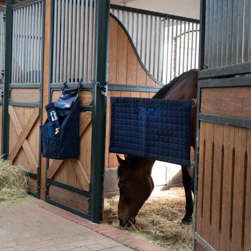 The Eskadron Box Stop Short is a practical and padded box curtain in navy, designed to be attached to the stable door opening. It provides a comfortable and safe barrier for your horse while allowing better airflow and visibility compared to a closed door. The quilted design adds stability and durability, while the adjustable straps ensure easy and secure attachment in different stable environments. With its size of 95 x 50 cm, it is easy to handle and suitable for everyday use.