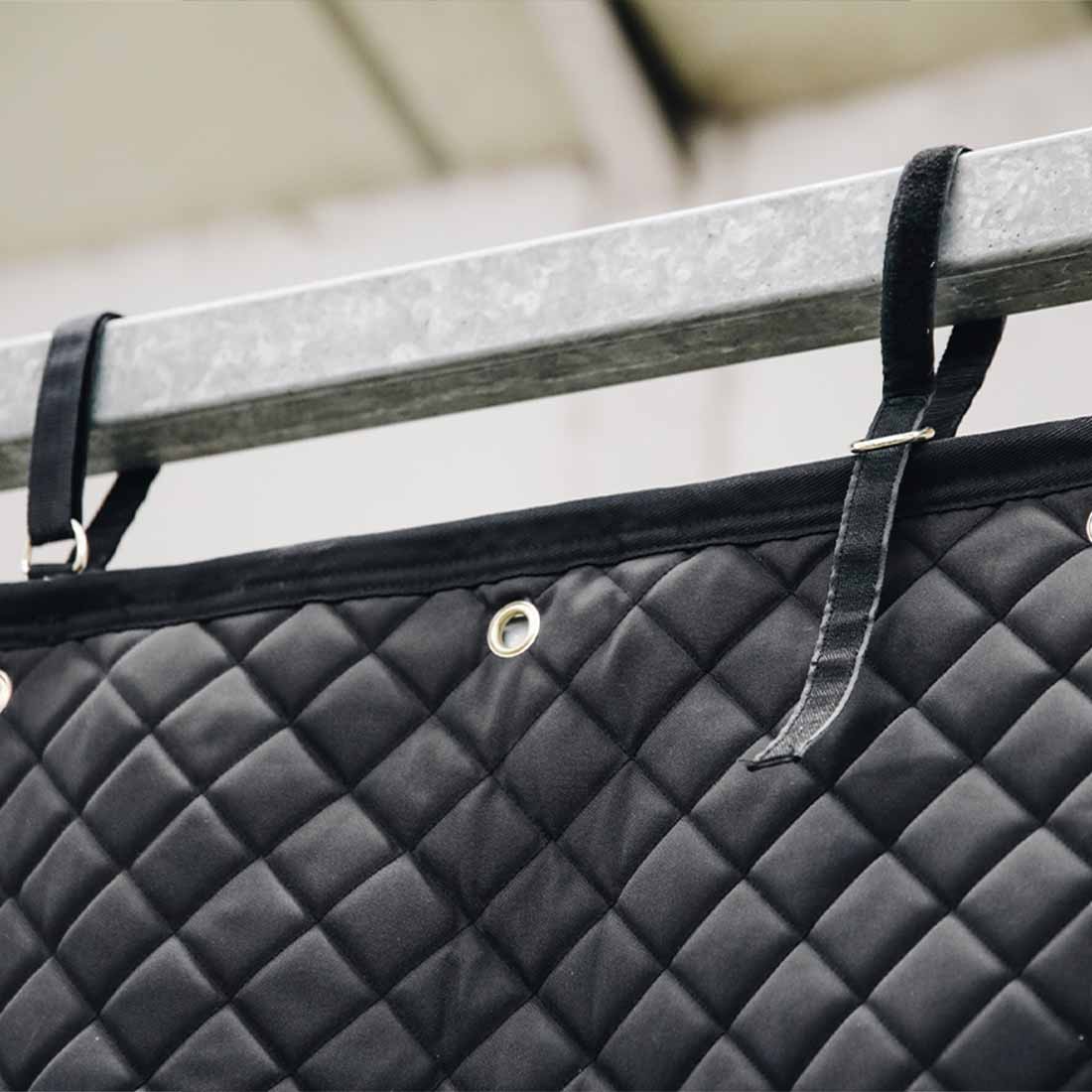 Kentucky's black, high-quality box curtain Waterproof enhances the horse's well-being by providing well-deserved tranquility in the box. The box curtain, equipped with 5 concealed carabiner hooks for hanging equipment and accessories, is easily hung on the box wall with the help of 5 integrated, reinforced hanging rings. The luxuriously quilted pattern, together with the discreet details in faux leather, also gives a truly exclusive feel.