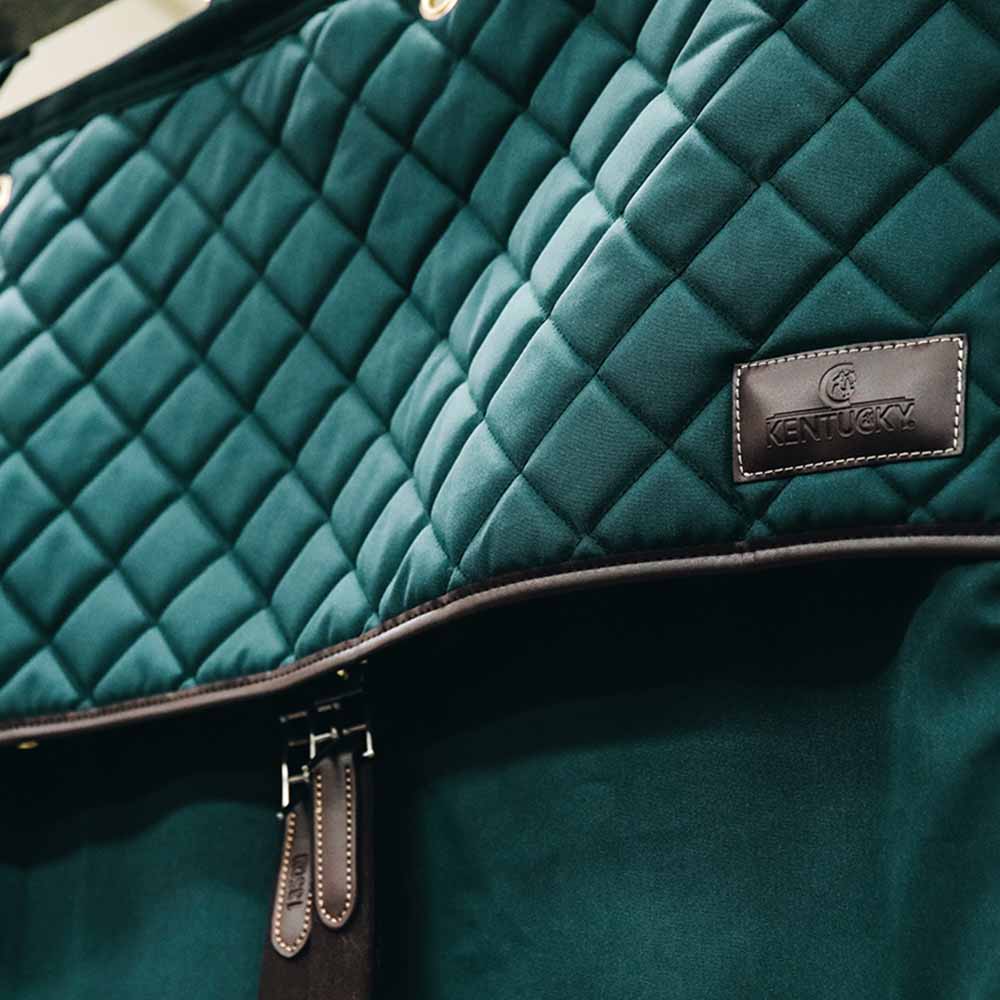 Kentucky's dark green, high-quality box curtain Waterproof enhances the horse's well-being by providing well-deserved tranquility in the box. The box curtain, equipped with 5 concealed carabiner hooks for hanging equipment and accessories, is easily hung on the box wall with the help of 5 integrated, reinforced hanging rings. The luxuriously quilted pattern, together with the discreet details in faux leather, also gives a truly exclusive feel.