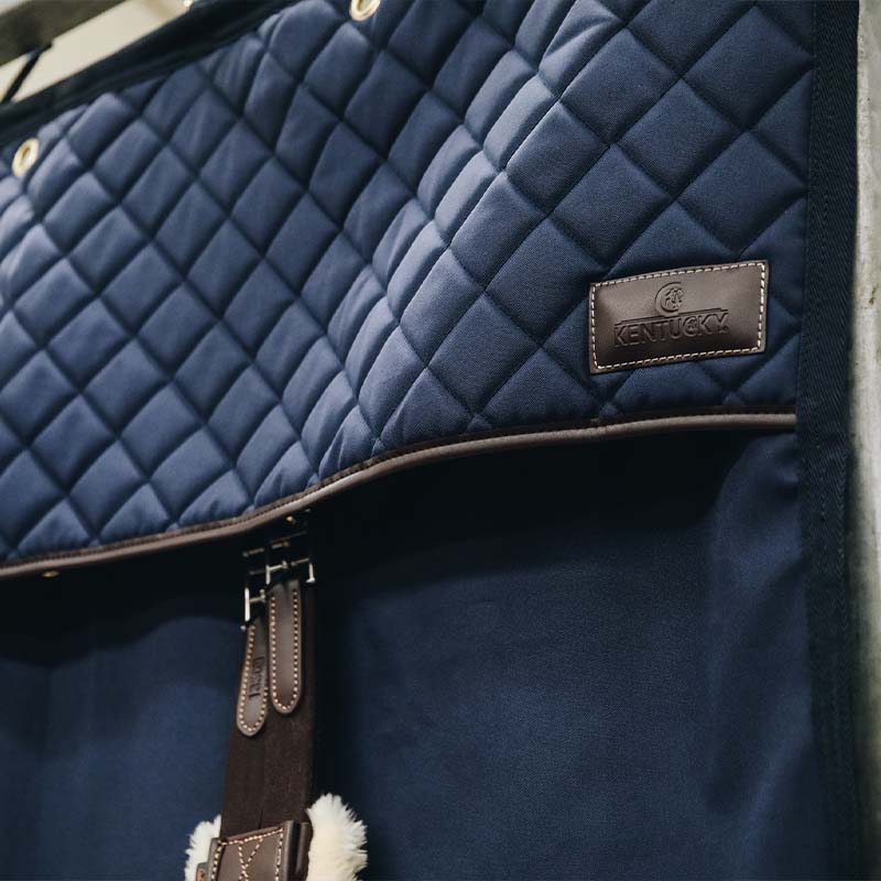 Kentucky's navy blue, high-quality box curtain Waterproof enhances the horse's well-being by providing well-deserved tranquility in the box. The box curtain, equipped with 5 concealed carabiner hooks for hanging equipment and accessories, is easily hung on the box wall with the help of 5 integrated, reinforced hanging rings. The luxuriously quilted pattern, together with the discreet details in faux leather, also gives a truly exclusive feel.