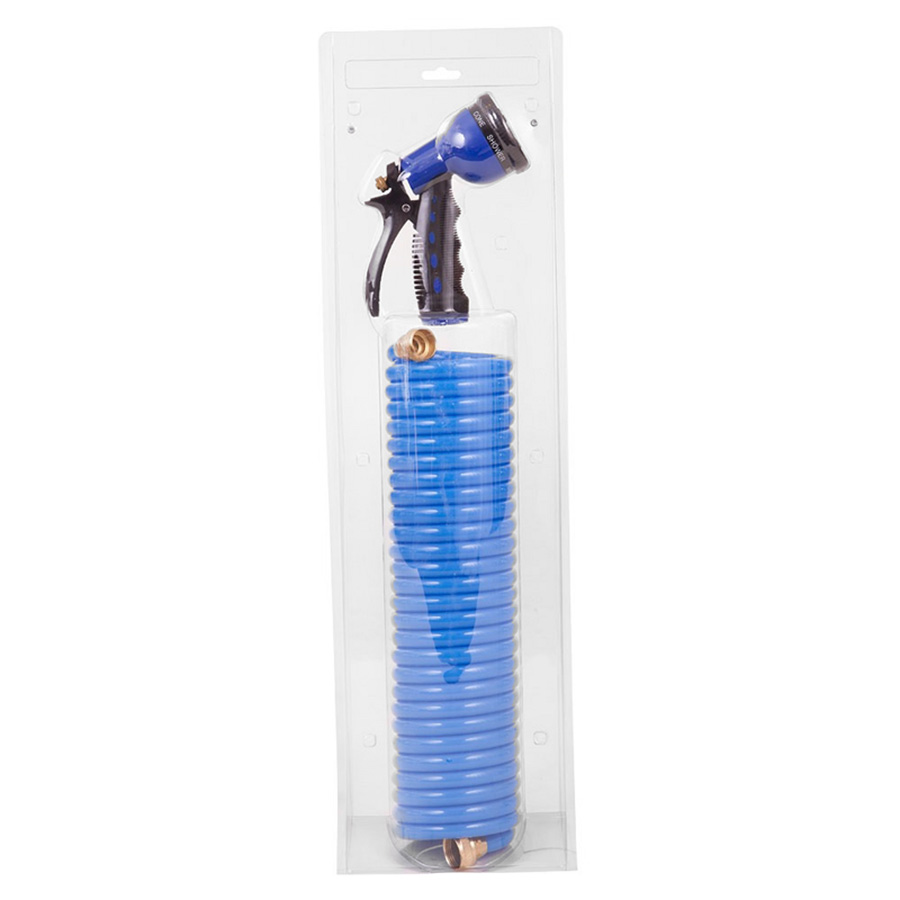 Blue, innovatively designed water hose from BR. The idea behind the spiral design is that the water hose shouldn't take up any space in the stable aisle, without compromising on the actual length. The spiral hose is 7.5m long and comes with an accompanying shower nozzle.