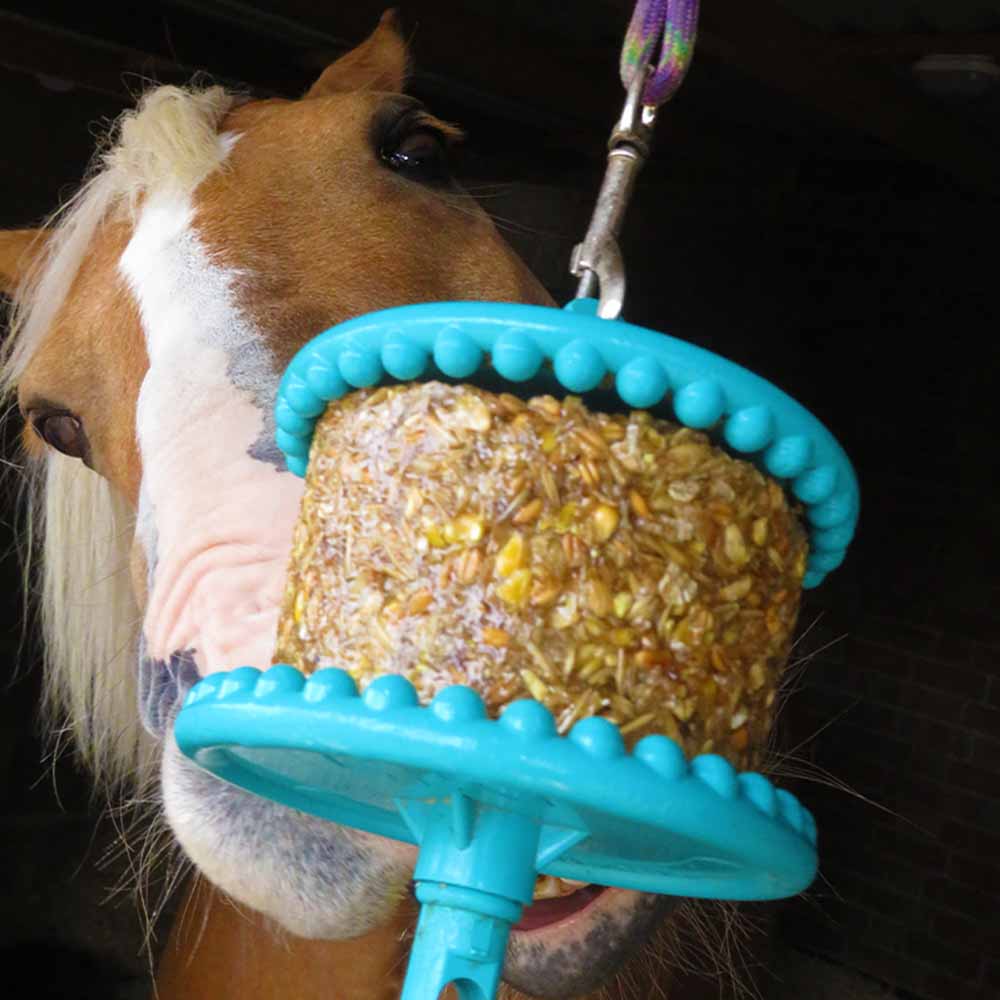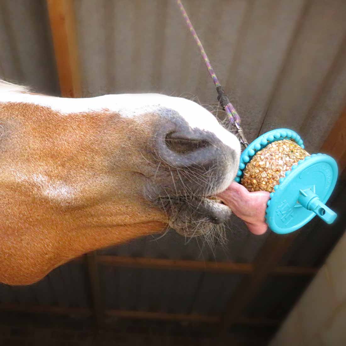 The refill lick attaches to Likit's traditional holder, which can be easily hung in the horse's stall or paddock. Holder sold separately.