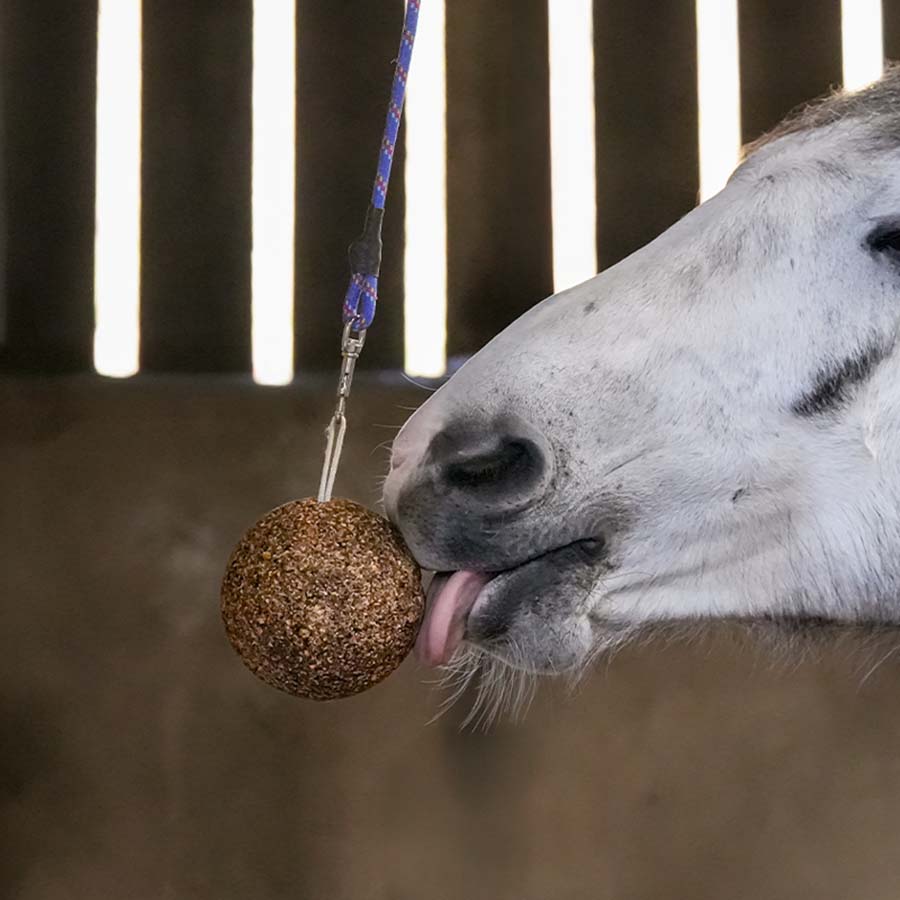 The principle is simply that the activity ball, with the help of the integrated rope, is hung up in the horse’s stall or paddock, so the horse can go and lick it whenever it wants. Ideal in competition stables, during stall rest, for horses that easily get bored and need something to occupy themselves with, or if you just want to spoil your horse with something extra tasty!
